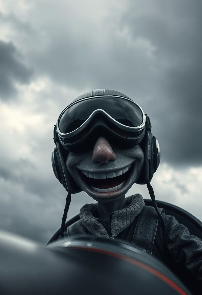 Character in the style of Gorillaz's Demon Days album|grey sky background|stark contrast|((pilot helmet))|eyes covered with dark glass frame|(stylized:1.5). Big mouth, smiling, wide smile, Riding plane, cloudy sky, grey sky, dark cloud. masterpiece, best quality, detailed, realistic, 8k UHD, high quality, lifelike, precise, absurdres, rendered in a cinematic, HDR style, 8K resolution masterpiece, best quality, detailed, realistic, 8k UHD, high quality, lifelike, precise, vibrant, absurdres, SimplepositiveXLv1, sfw <lora:xl_more_art-full-beta1:0.7>