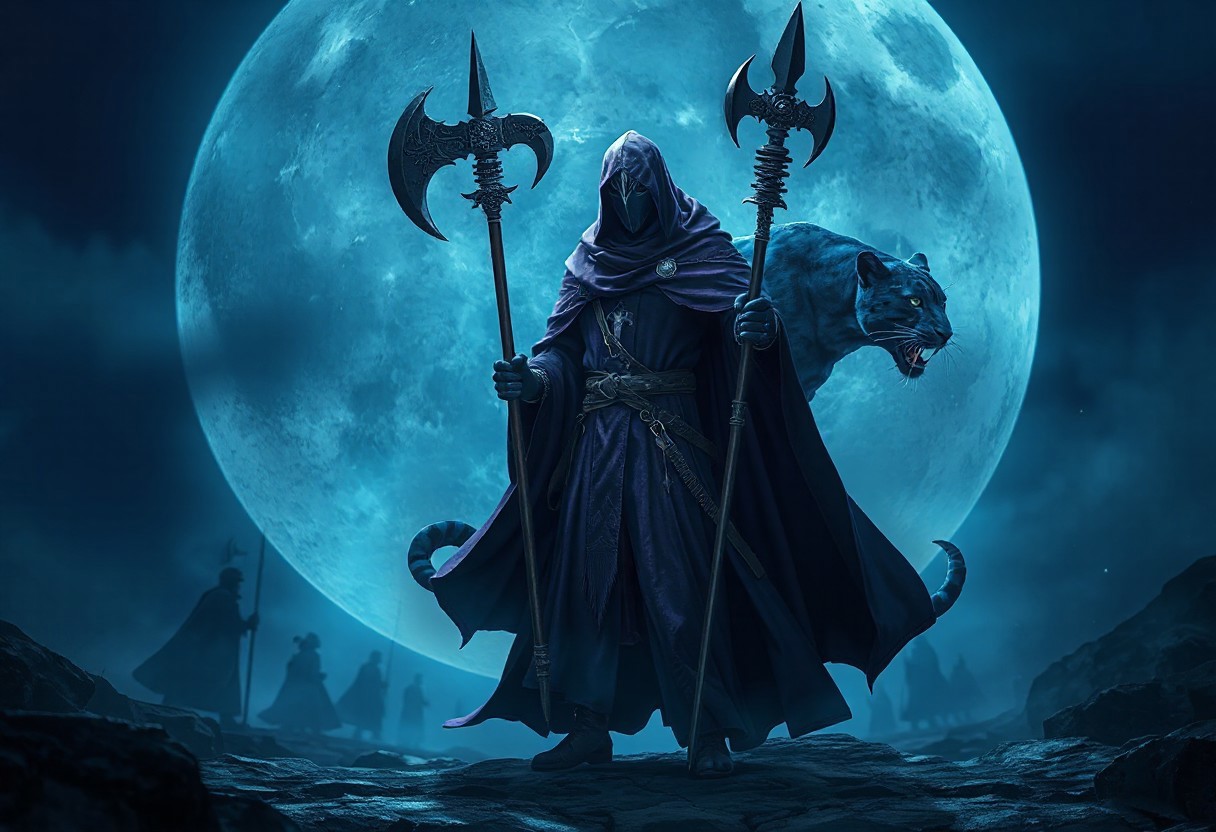 1. "Capture the Sacred Knight's Spearholder on a Shadow Moon, dressed in a full-body purple cloak, wielding an axe, and accompanied by a blue panther. Use micro details, lifelike details, and the golden ratio to create a highly detailed, 8k image with a dark blue misty background. Cinematic lighting and dark figures walking in the background will add to the atmosphere." 2. "Create a high-concept art piece featuring the Sacred Knight's Spearholder on a Shadow Moon, dressed in a full-body purple cloak and wielding an axe. Include a shepherd's crook, a forged sword, and the blue panther. Use micro details, lifelike details, and the golden ratio to create a highly detailed, hyper-realistic, 8k image with intricate jewelry and symmetrical compositions. Add cinematic lighting and dynamic, ambient, and volumetric lighting to enhance the mood." 3. "Design a detailed, 8k, HD, realistic illustration of the Sacred Knight's Spear