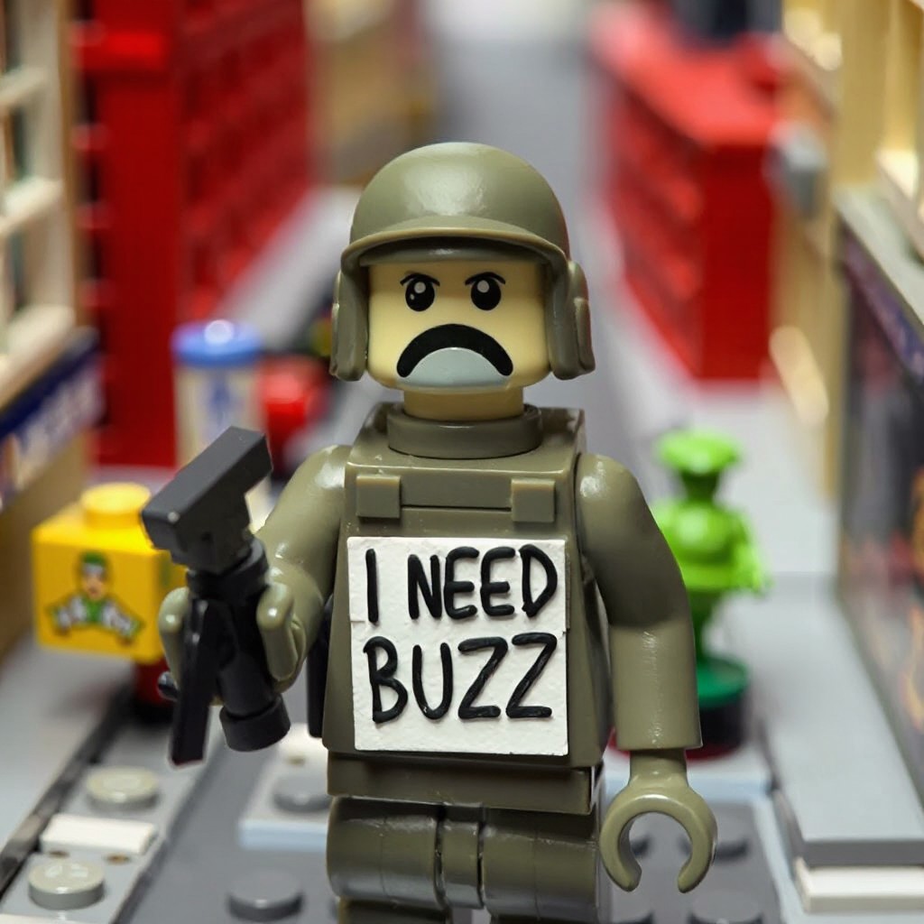 Plastic soldier make of clay holding sigh written ‘I NEED BUZZ’ in a miniature city like it's make of lego.