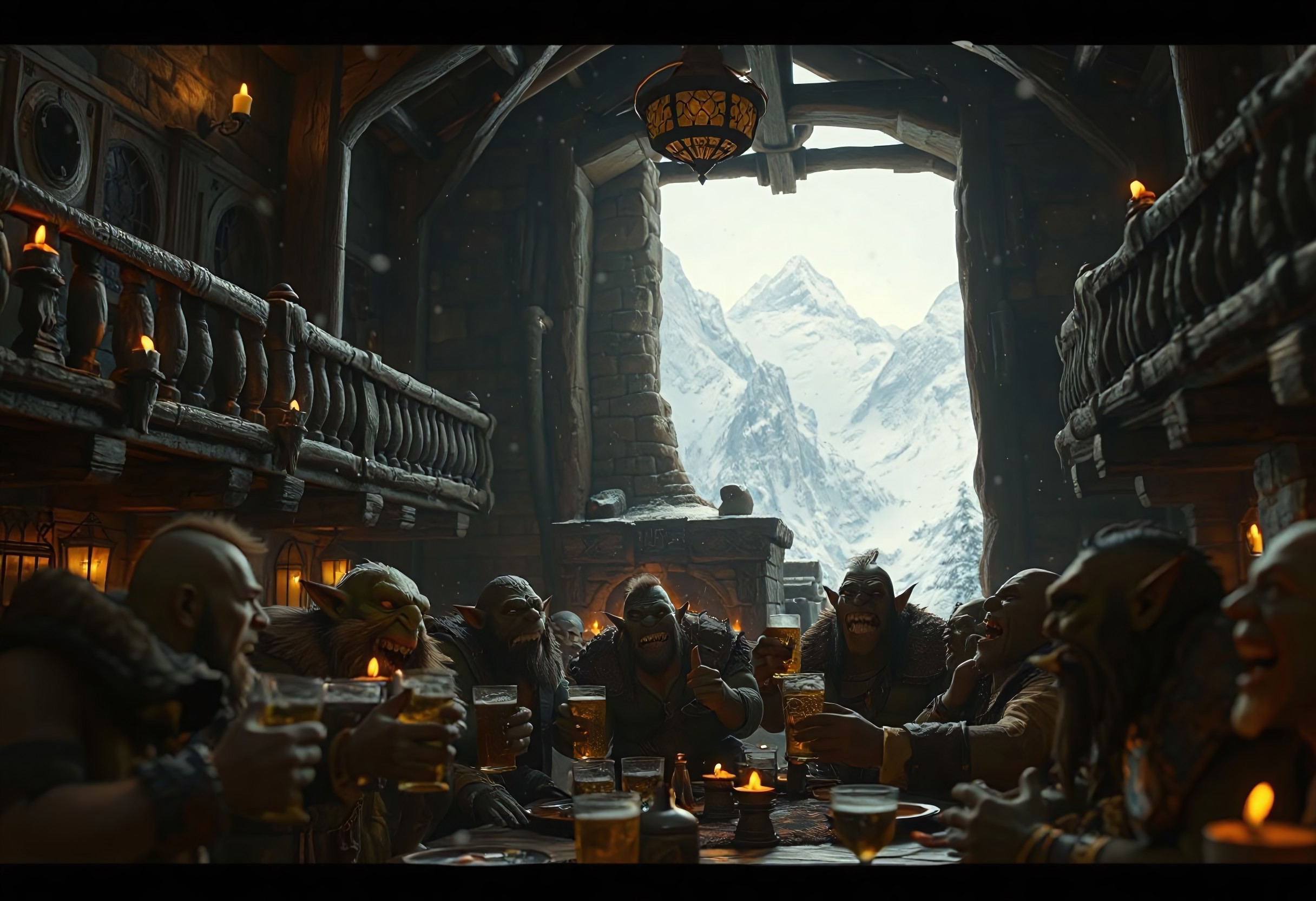 a frame of a 5-second cinematic claymation-style video in a fantasy tavern with ultra-detailed textures and photorealistic lighting. The tavern has multiple levels—three floors with varying heights and wooden balconies. Cold ambient tones dominate, with warm light accents from a central fireplace and scattered candles. An open door at the far end reveals a snowy mountain landscape; snow blows into the tavern, subtly swirling in the air. Inside, orcs (in Warcraft style) are laughing, drinking, and celebrating in a rowdy, festive atmosphere. Shot like a claymation scene with handcrafted character detail and set textures. Simulated full-frame DSLR camera with an 85mm lens at f/1.8, shallow depth of field, ISO 400, 1/100 shutter speed. Natural light with soft post-processing: subtle contrast boost, epic cinematic tone grading, and slight depth haze in background.