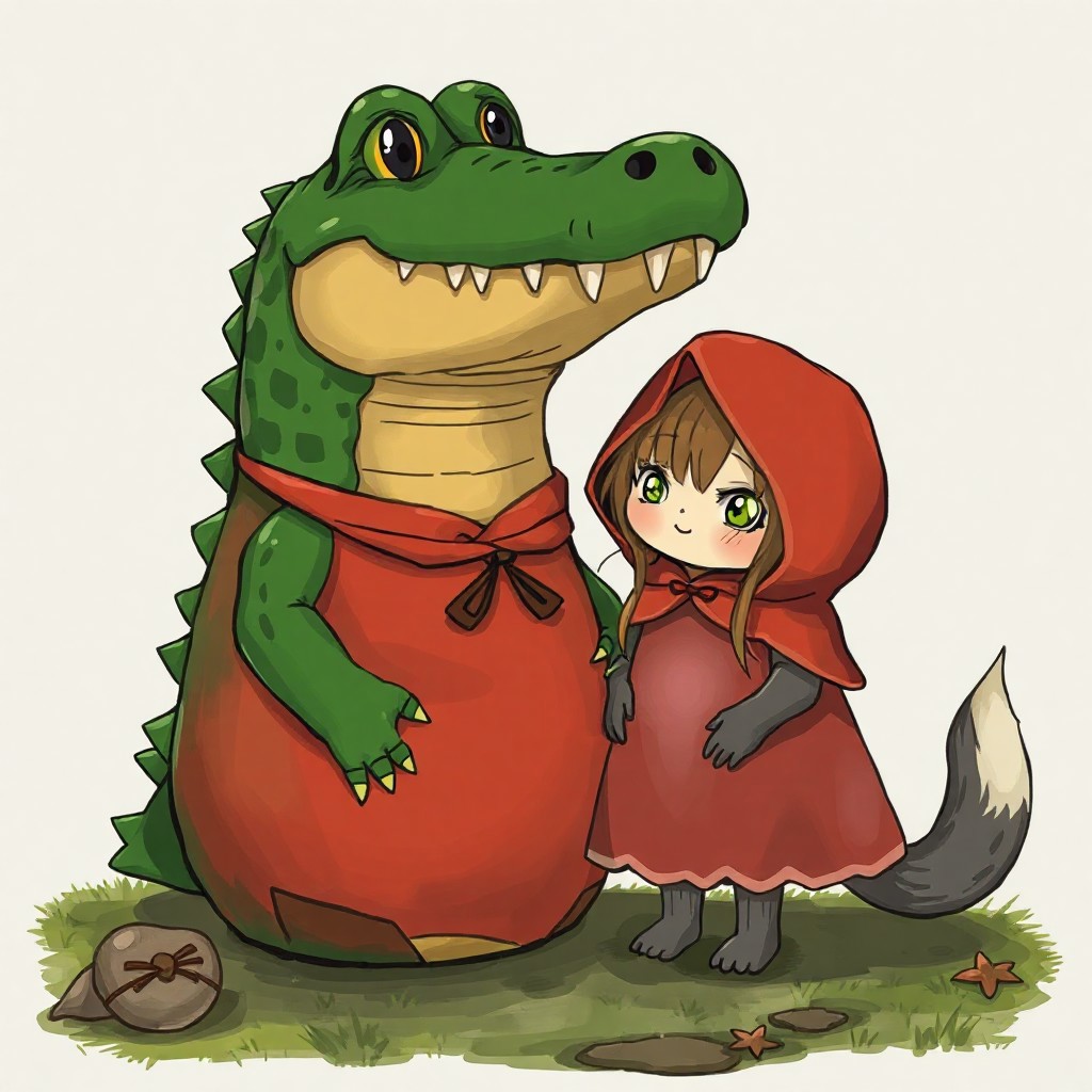 a crocodile matryoshka doll and the little shy red riding hood wolf girl, no humans, anime style