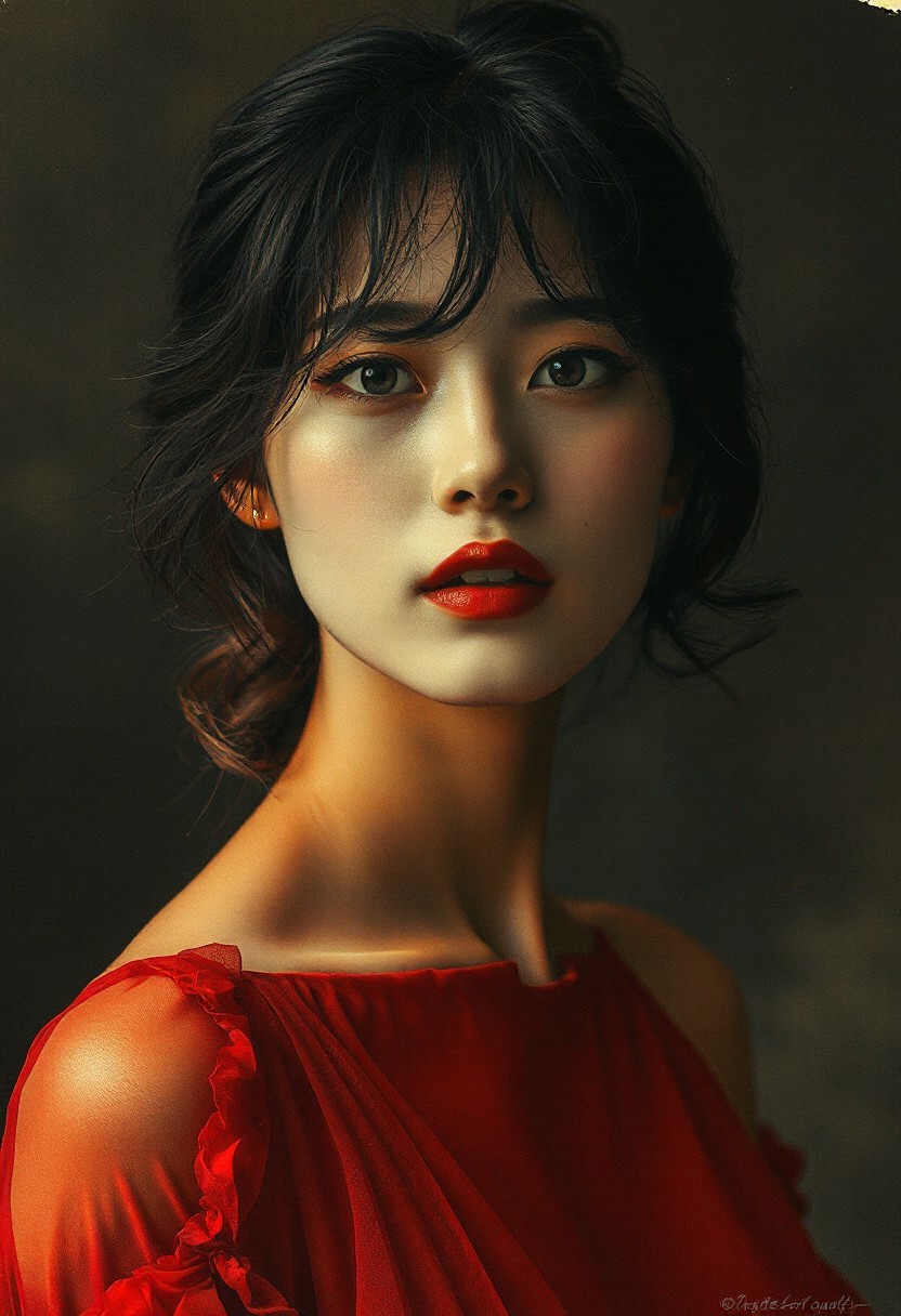 photorealistic ink poster, double exposure image, the first image is located at the top, it shows a portrait of a beautiful oriental woman in a short red dress, with disheveled hair, bare shoulders, slightly parted lips, detailed fabric, [masterpiece], [best quality], chiascuro,