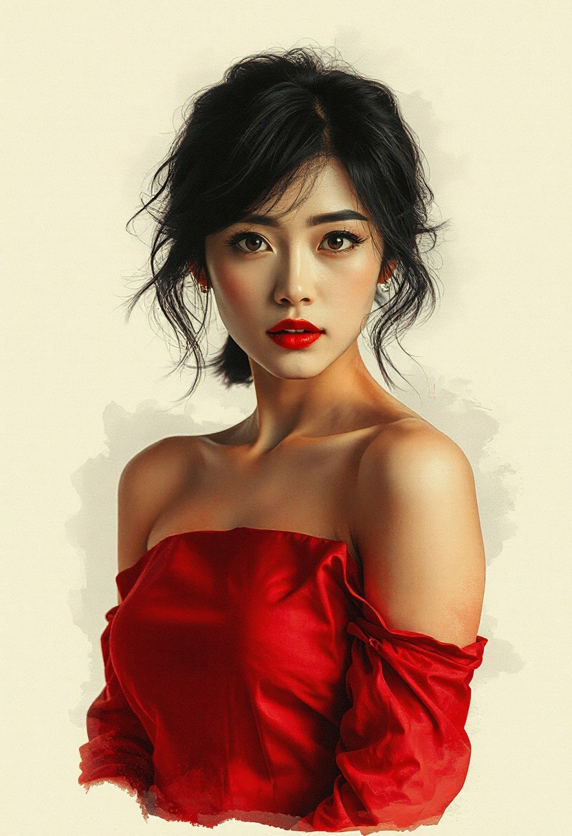 photorealistic ink poster, double exposure image, the first image is located at the top, it shows a portrait of a beautiful oriental woman in a short red dress, with disheveled hair, bare shoulders, slightly parted lips, detailed fabric, [masterpiece], [best quality], chiascuro,
