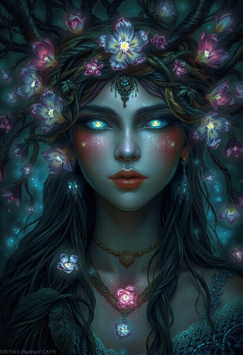 A magical forest princess crowned with woven vines and bioluminescent flowers, her eyes glowing with the wisdom of ancient spirits. Stylized naturalism with touches of Brian Froud, Alphonse Mucha, and Agnes Cecile.