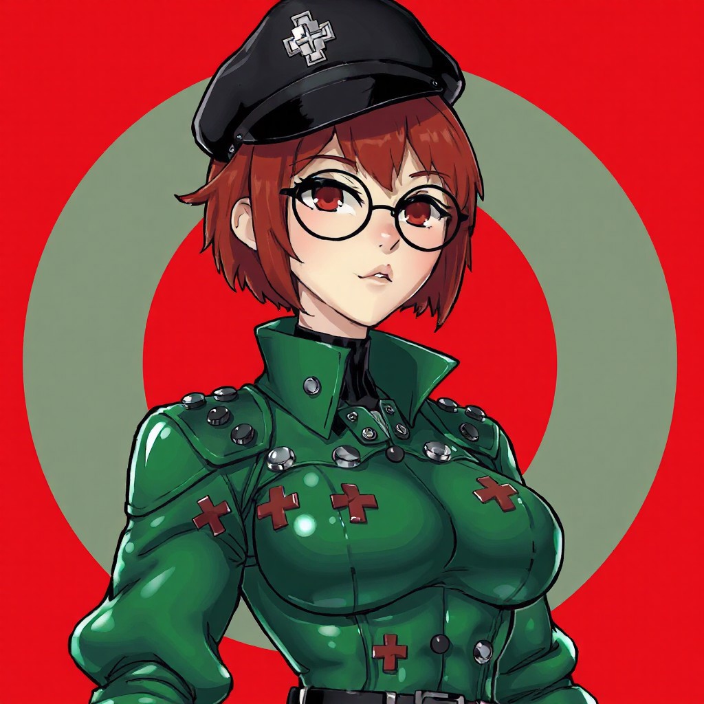 G0thicL1nes, a stylized character with a striking appearance. The character is depicted with pale skin and short, red hair, wearing a military-style black cap adorned with a silver emblem. She has round glasses and a confident expression. The outfit is a glossy green, form-fitting ensemble with intricate details, including a high-collared coat and multiple red cross motifs. The character's attire is accessorized with belts and metallic elements, contributing to a futuristic, authoritative look. Her body is alluring and seductive, with large breasts and small waist. The background is a solid, vibrant red, enhancing the dramatic and bold aesthetic of the image. <lora:FluxMythG0thicL1nes:1>