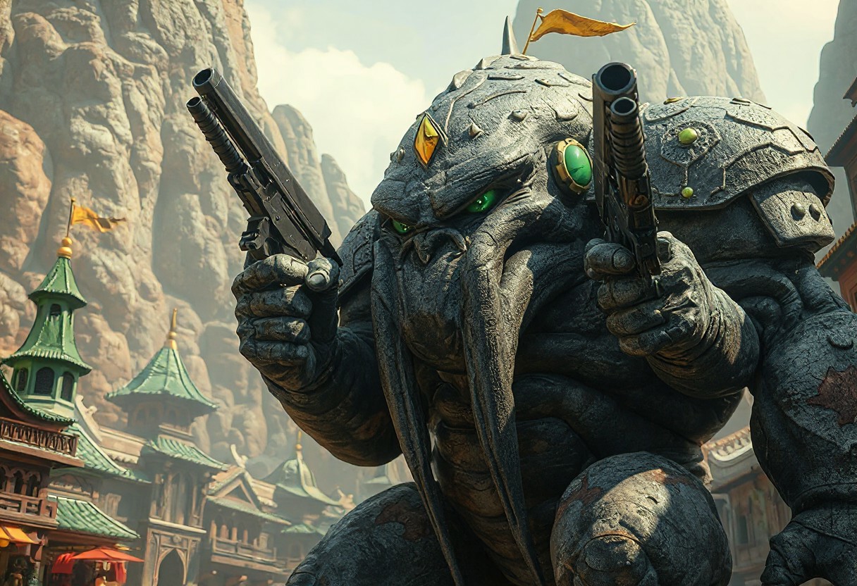 "Immerse yourself in the epic scene of a colossal Gorgonic Golem standing guard in an ancient city. This 4K, hyper-realistic artwork showcases the Golem's detailed face, adorned with green and yellow accents, and equipped with two guns. The city's buildings, including a green one with a white roof, contrast the gray surface, enhancing the playful setting. The Golem's dynamic action pose, vivid emotions, and captivating lighting bring this cinematic masterpiece to life, making it perfect for CGSociety or Artstation's trending page. Experience the intricate detail and photorealistic quality with dynamic lighting and coherent artwork."