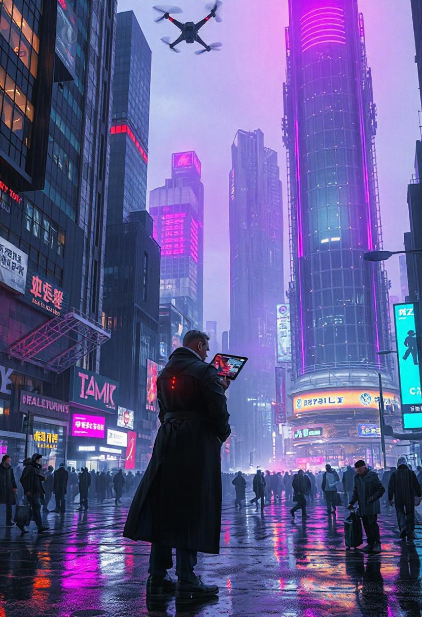 cyberpunk metropolis, sprawling neon-lit towers, reflective glass facades, pulsating purple lights, hovering drones, trailing exhaust, lone figure, cyber-enhanced arm, glowing red circuits, wearing a trench coat, black with silver trim, holding a holographic tablet, surrounded by crowded streets, flickering holograms, scattered trash, faint rain, wet pavement, distant siren wails, air thick with smog, ultra-detailed, 8k, realistic, hyperrealistic, very detailed atmosphere, high contrast, score_10up, score_9up, score_8up, vibrant futuristic scene