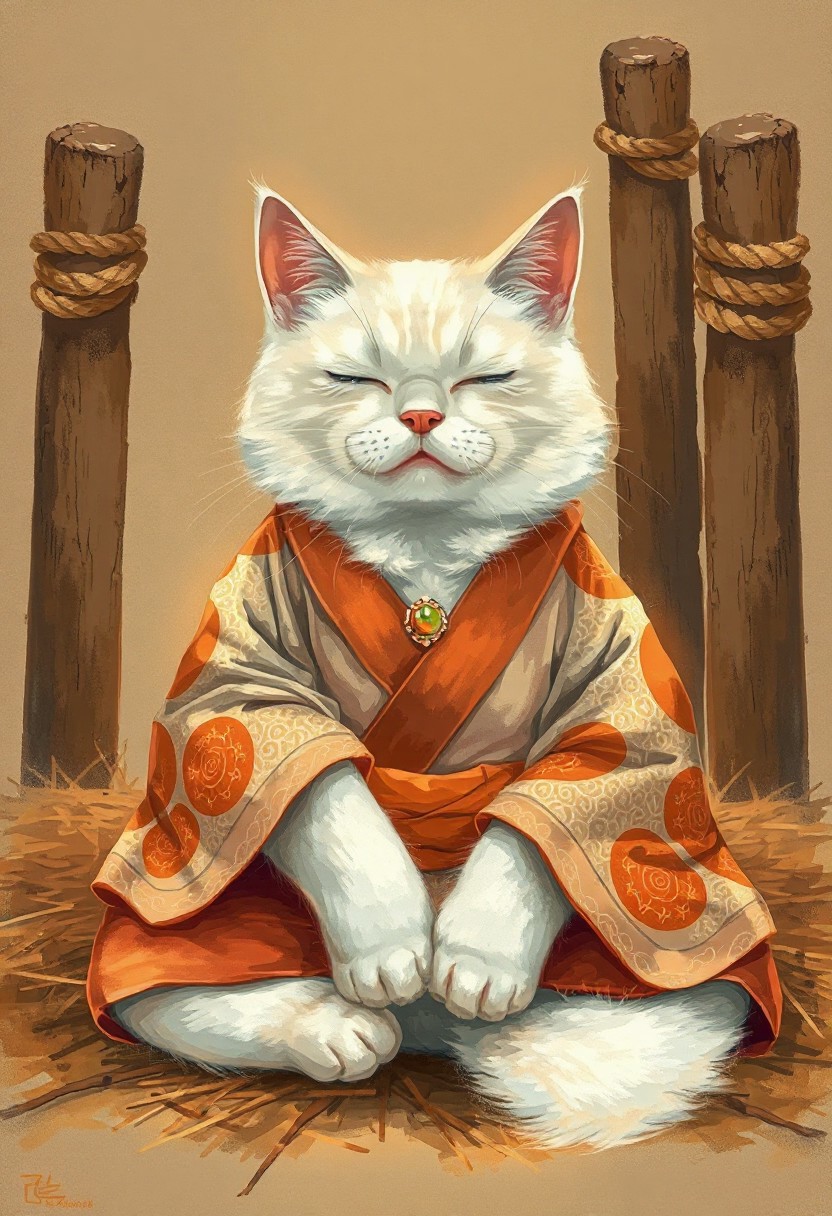 A white cat, resembling a aloha shirt, is seated in a meditative pose, reminiscent of a Zen master. The cat is wearing a traditional Japanese-style kimono, featuring orange and maroon patterns. The kimono's details include an orange obi (sash) and a decorative jewel-like stone on it. The cat's fur is fluffy and long, with a soft, delicate appearance. Its eyes are closed, giving a peaceful and serene expression. The cat's body is positioned in a relaxed, seated posture, with paws resting on its lap. It is centered in the image and facing the viewer directly. The background is a muted, earthy tone, with a depiction of hay or straw, creating a tranquil atmosphere. Wooden posts with rope are visible in the background, contributing to a rustic, serene setting. The lighting is soft and warm, highlighting the cat's features and the kimono's patterns. The overall style is artistic, with detailed brushstrokes and soft color blending. The image exudes a sense of calm and tranquility. fir needle style,