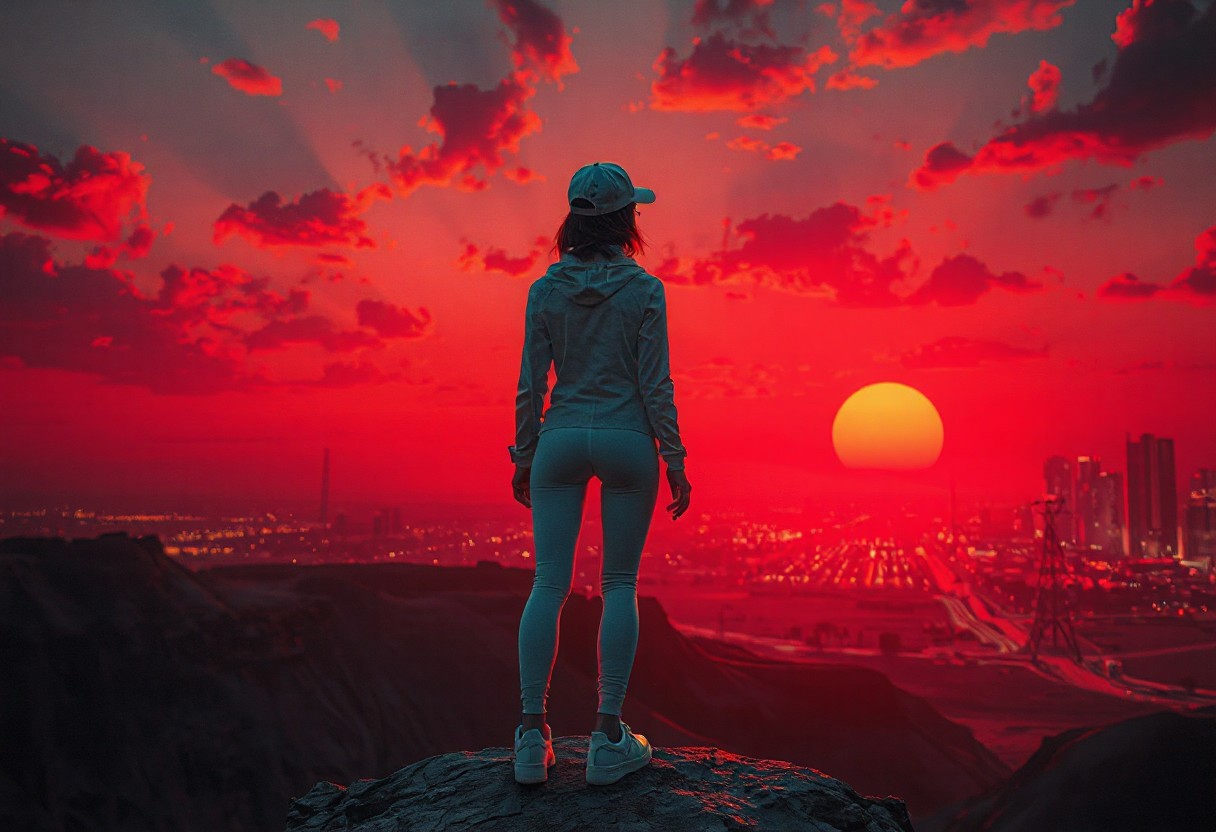 highly detailed cgi artist Style, colorfull, in a desert, warm red early morning, hot, detailed soft glowing clouds. dim red sun, city lights and high buildings in the far background, dark shadows, strong shadows, dramatic lighting, dark theme, dark, rimlight, highly detailed, low angle backshot, woman, standing on a cliff, back to the camera, short red glowing hair, thight white jacket, white cap, tight white leggings, white sneakers, slim body, tight ass, tight legs,
