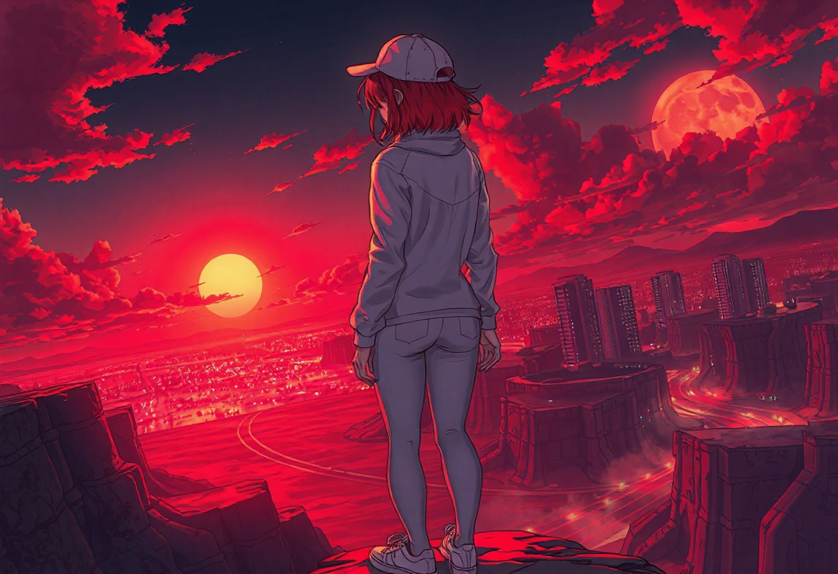 highly detailed manga artist Style, colorfull, in a desert, warm red early morning, hot, detailed soft glowing clouds. dim red sun, city lights and high buildings in the far background, dark shadows, dramatic lighting, dark theme, dark, rimlight, highly detailed, low angle backshot, woman, standing on a cliff, back to the camera, short red glowing hair, thight white jacket, white cap, tight white leggings, white sneakers, slim body, tight ass, tight legs,