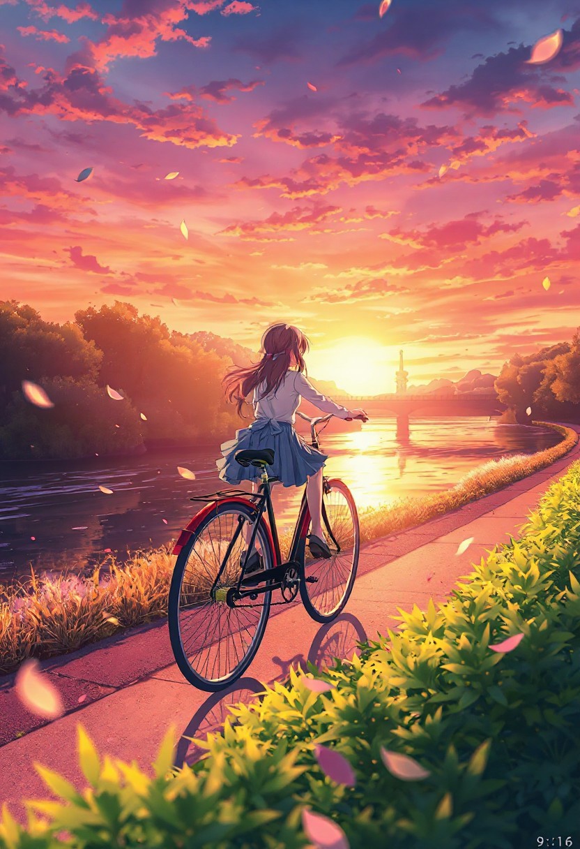 Vertical 9:16 cinematic anime scene, anime girl riding a bicycle along a riverside path during sunset, vibrant colors reflecting off the water, small petals flying in the wind, lush green bushes in the foreground, dreamy anime pastel look, very dynamic composition.