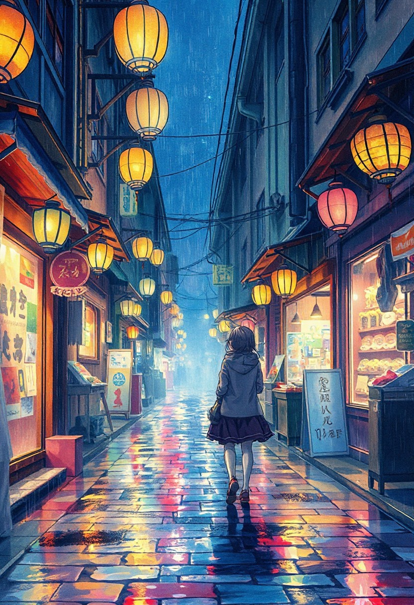 Vertical 9:16 cinematic anime scene, narrow old shopping street glowing with warm lanterns at night, anime couple walking side by side under light rain, colorful reflections on wet stones, cozy nostalgic atmosphere, pastel colors, highly detailed anime watercolor texture.