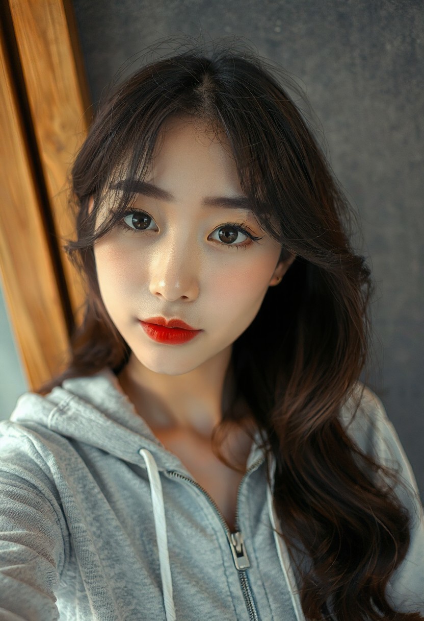 DLSR photograph, slender, beautiful 26 year old korean model . Pale skin, lighting<lora:MoriiMee_Gothic_Niji_Style_FLUX:0.3500000000000001> <lora:AsirAsianPhotographyflux:0.7000000000000002> "A close-up selfie of a young woman with long, dark brown wavy hair. She has fair skin, delicate facial features, and is wearing subtle eye makeup with a touch of pink blush on her cheeks and bold red lipstick. She is wearing a light gray zip-up hoodie. The background is slightly out of focus, showing a textured gray surface and a glimpse of vertical wooden panels in warm tones. The lighting is soft and even, highlighting her features. The overall mood is serene and slightly glamorous."