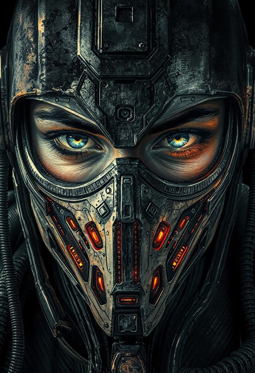 An extremely fully detailed depiction mix of a human-machine hybrids, girl in mask, extremely detailed, epic, intricate detail, futuristic, Sci-fi, cinematic, high contrast, Hyperrealistic, medium close-up, (Dark Side of Light:0.5), (Ink Wash Fusion:0.6), (L'Homme au Masque de Fer:0.8)