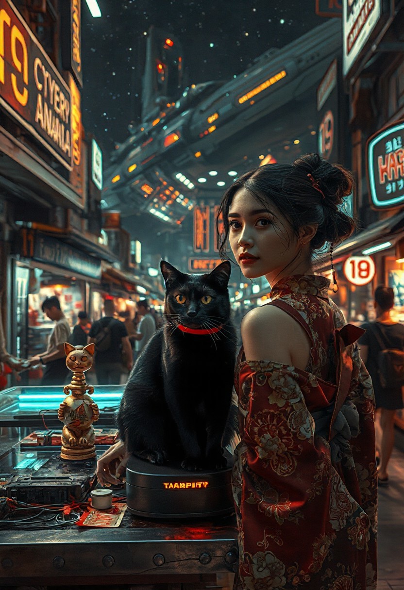 Setting is a futuristic cyberpunk street market at night, the market is comprised of street vendors selling robot parts, food, weapons, and robot pets. People wearing futuristic cyberpunk clothing are walking through the street market shopping and eating, A sleek black cat with red collar sits on a cluttered metal riveted desk with transparent top and micro-LED lighted computer components visible inside, On the desk is an ebony and gold maneki neko statue and futuristic art deco lighting, (((a beautiful woman, 24 years old, is standing in the foreground facing the viewer, she has an expression of interested curiosity)))))), the sleek black cat with red collar is sitting on the desk and watching the people walking by in the busy street market, the woman is dressed in futuristic cyberpunk Japanese style kimono-style clothing that are sexy and Japanese classic aesthetic. An enormous art deco inspired starship with futuristic lighting and an enormous space station are visible in the background among the stars, The woman's hair is elegantly tied up with a ribbon. Artistic cyberpunk, dynamic perspective, (((overall architectural aesthetic is Art Deco Cyberpunk))). Epic image that elicits a feeling of wonder and awe, part of the interior is visible,