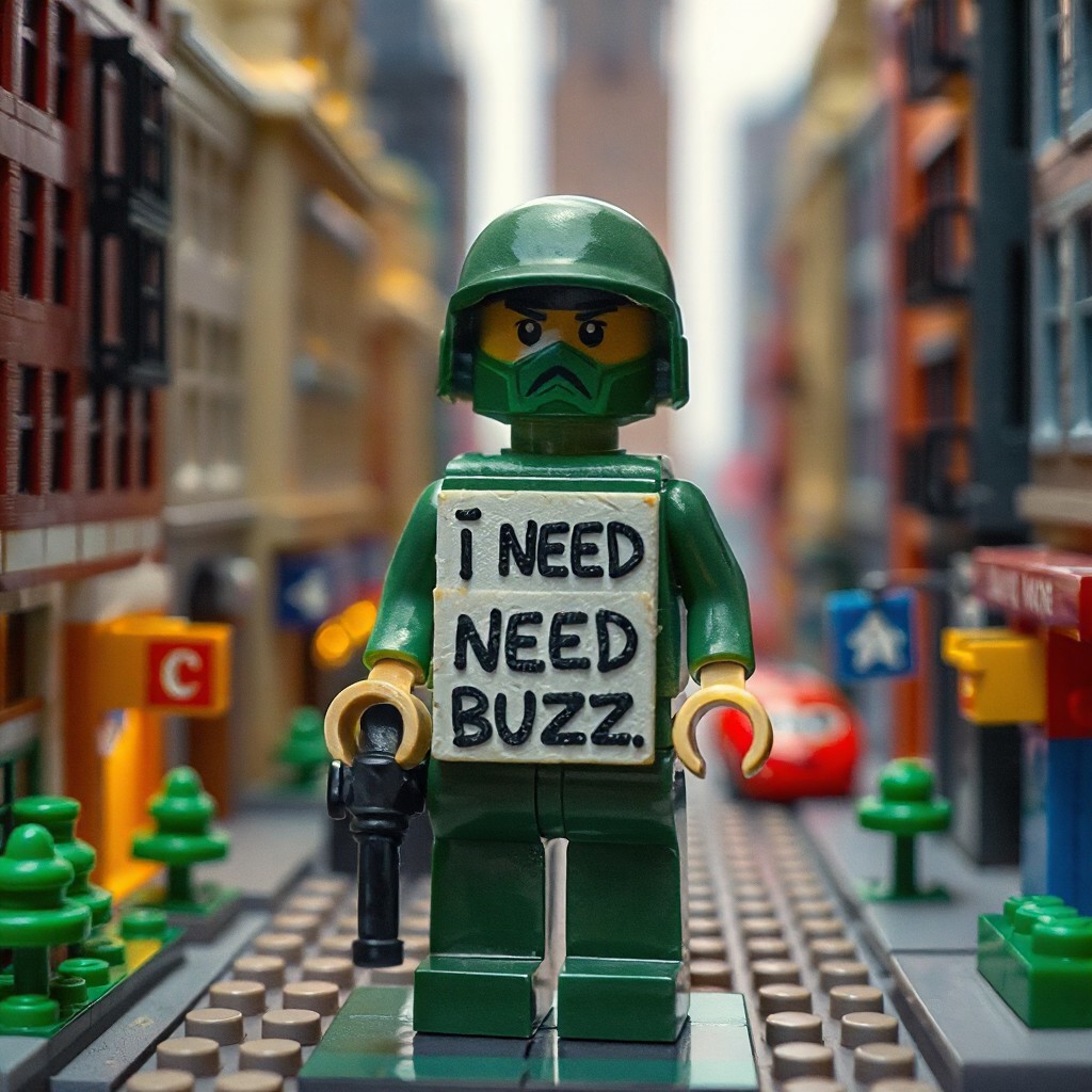 Plastic soldier make of clay holding sigh written ‘I NEED BUZZ’ in a miniature city like it's make of lego.