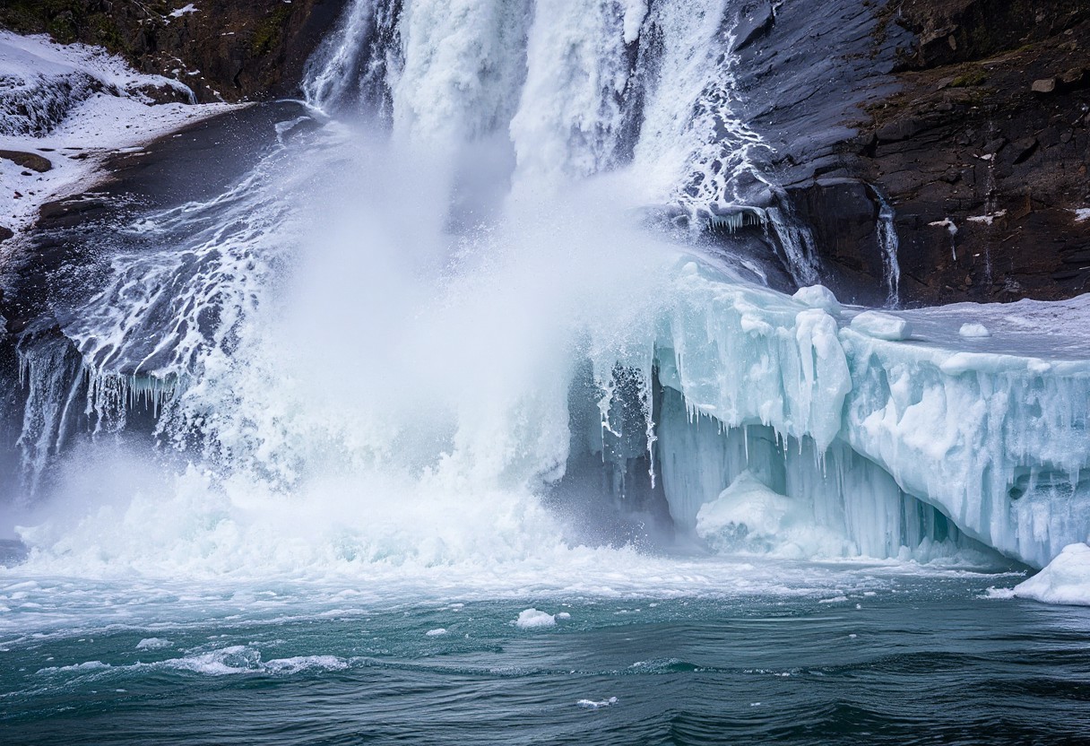 A breathtaking masterpiece—an awe-inspiring display of nature's raw power and delicate artistry. The waterfall bursts forth with unbridled energy, its silver torrents cascading down a frozen cliffside in a dynamic, almost theatrical entrance. The rushing water collides with the ice, shattering into mist and diamond-like droplets, creating an ethereal contrast between movement and stillness. The smooth, glassy ice glistens under the light, reflecting the chaotic dance of liquid and frozen elements. A symphony of forces—water carving its path, ice standing its ground—locked in a mesmerizing duel that captivates the senses.