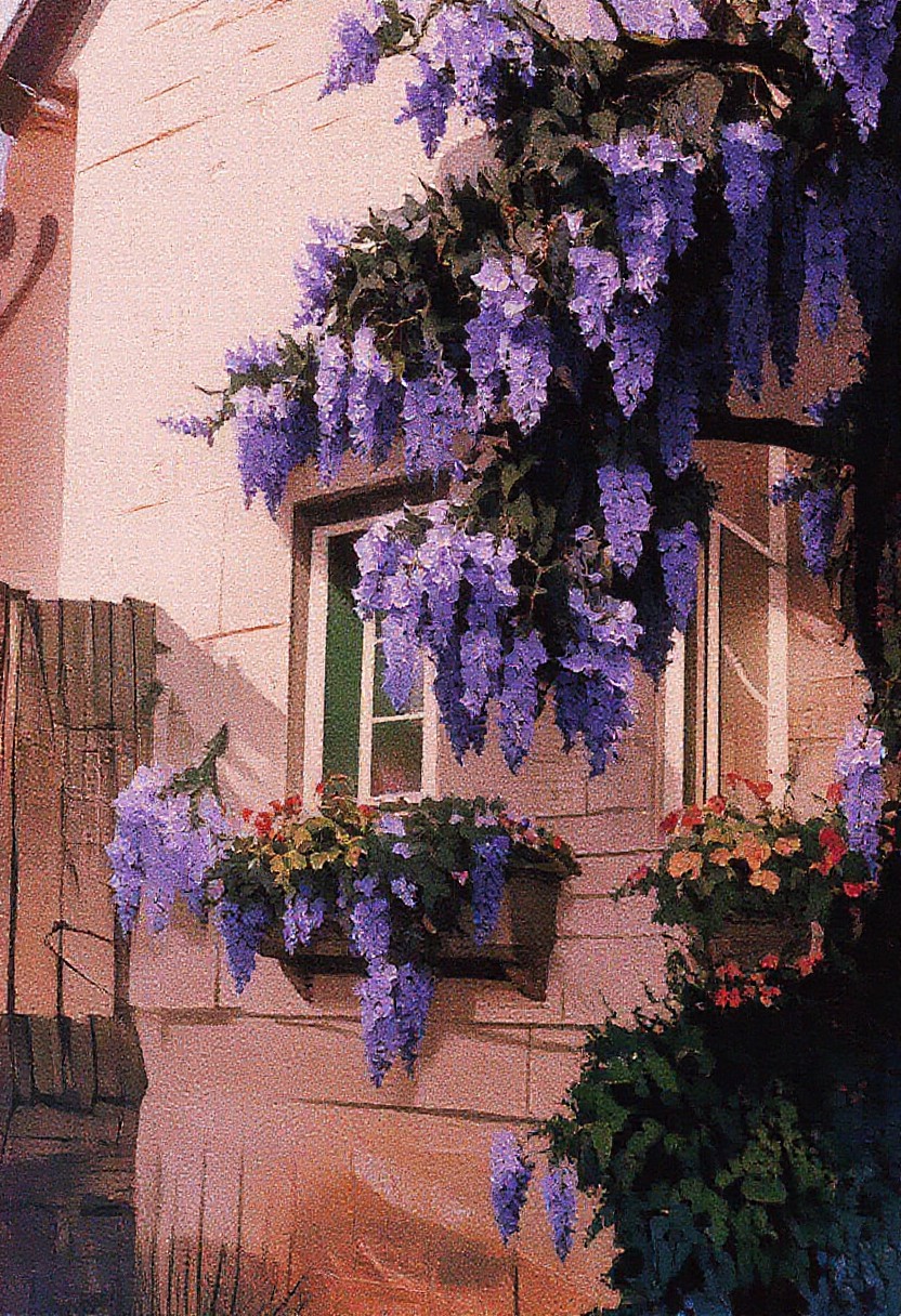 The overall atmosphere of the scene is one of tranquility, natural beauty, and a sense of timeless charm. The interplay of the vibrant wisteria against the muted tones of the house creates a visually striking and emotionally evocative image. The scene suggests a peaceful dwelling, embraced by nature's beauty, a place where the senses are awakened by the sight and imagined fragrance of the abundant blooms. The meticulous care of the window boxes further emphasizes a connection between the inhabitants and their surroundings, highlighting a love for beauty and detail. The composition should evoke a feeling of serenity and wonder, capturing the magical essence of a house adorned by the full glory of a blooming wisteria. The lighting should be soft and even, avoiding harsh shadows to emphasize the delicate beauty of the flowers and the gentle character of the dwelling. The focus should be sharp on the wisteria and the architectural details it embraces, drawing the viewer into this enchanting tableau.