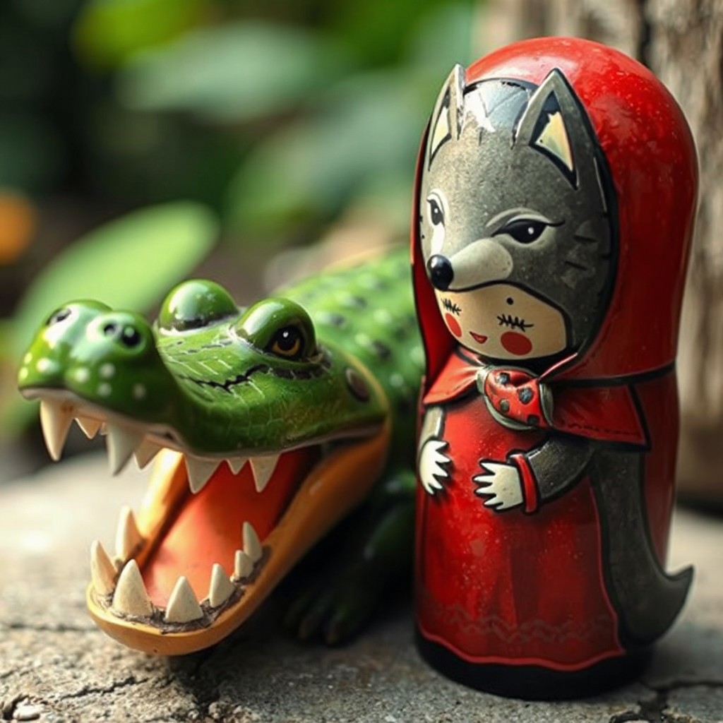 a crocodile matryoshka doll and the little shy red riding hood wolf girl, no humans