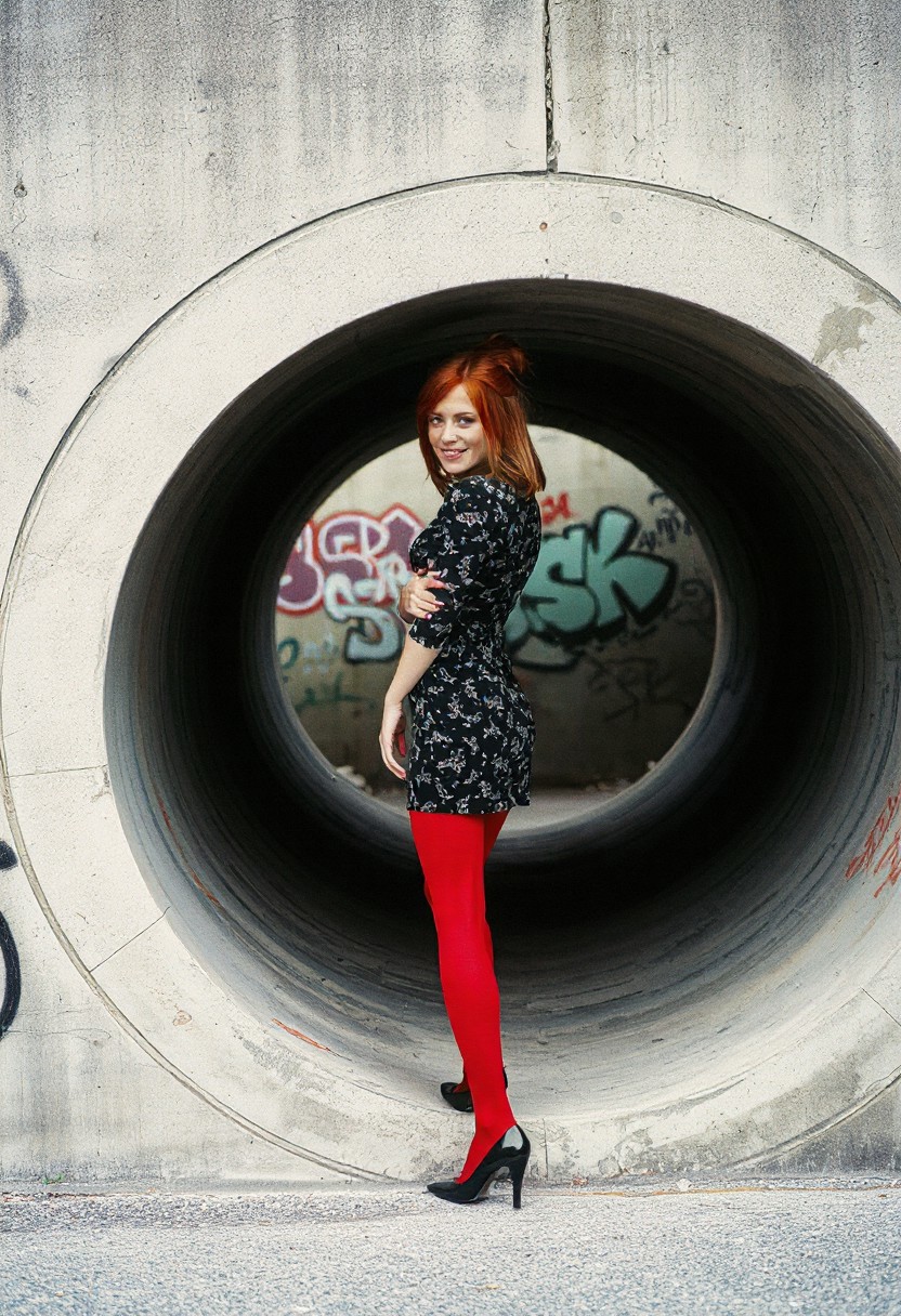 Photograph of a beautiful 20 year old redhead woman with shoulder-length hair in a loose bun. She is wearing a short, tight black print dress, red leggings, and black patent leather shoes with low heels. She is standing inside a large concrete storm culvert set into a concrete wall. The wall is covered with graffiti. Viewed from the side, her head turned toward the viewer. She is smiling at the viewer with her mouth closed. Film photo, film grain, professional photo shoot.