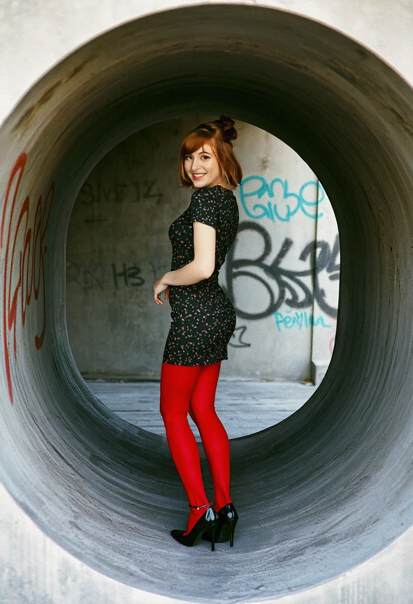 Photograph of a beautiful 20 year old redhead woman with shoulder-length hair in a loose bun. She is wearing a short, tight black print dress, red leggings, and black patent leather shoes with low heels. She is standing inside a large concrete storm culvert set into a concrete wall. The wall is covered with graffiti. Viewed from the side, her head turned toward the viewer. She is smiling at the viewer with her mouth closed. Film photo, film grain, professional photo shoot.