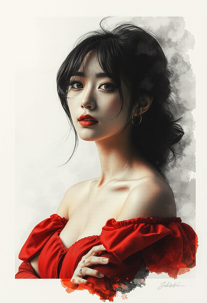 photorealistic ink poster, double exposure image, the first image is located at the top, it shows a portrait of a beautiful oriental woman in a short red dress, with disheveled hair, bare shoulders, slightly parted lips, detailed fabric, [masterpiece], [best quality], chiascuro,