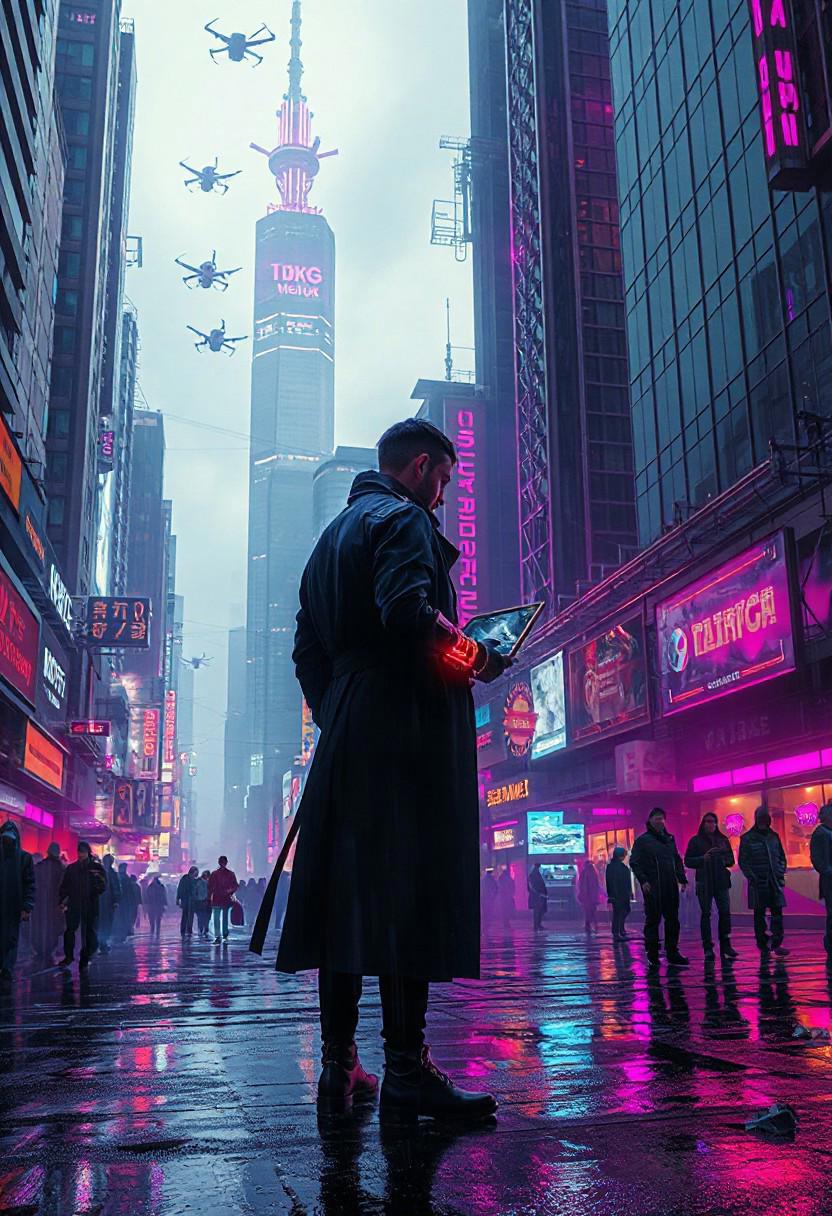 cyberpunk metropolis, sprawling neon-lit towers, reflective glass facades, pulsating purple lights, hovering drones, trailing exhaust, lone figure, cyber-enhanced arm, glowing red circuits, wearing a trench coat, black with silver trim, holding a holographic tablet, surrounded by crowded streets, flickering holograms, scattered trash, faint rain, wet pavement, distant siren wails, air thick with smog, ultra-detailed, 8k, realistic, hyperrealistic, very detailed atmosphere, high contrast, score_10up, score_9up, score_8up, vibrant futuristic scene