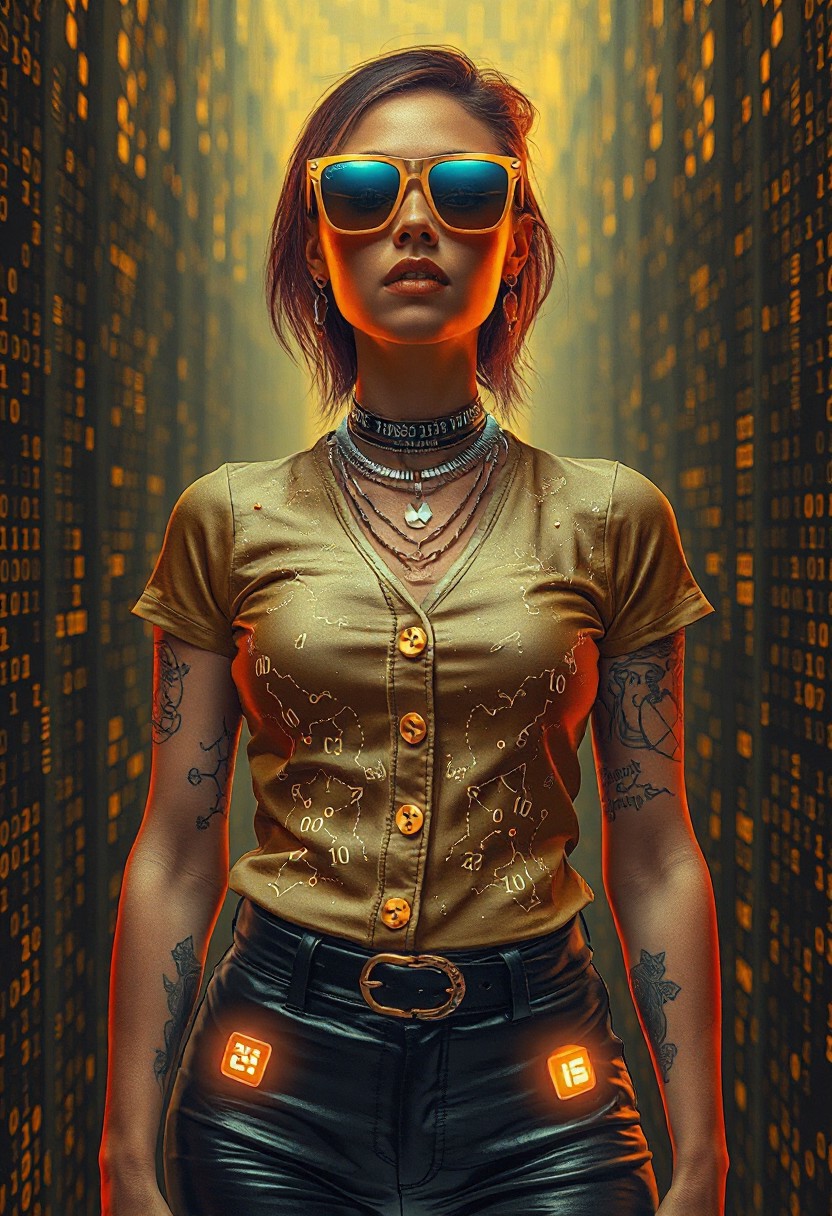 A cybernetic labyrinth filled with scrolling code streams. The woman’s gold-buttoned top is embroidered with pixel-art constellations, while her leather pants pulse with embedded LED circuits. Her sunglasses reflect strings of binary, and the layered necklace projects holographic runes. The background is a grid of shifting yellow and orange pixels, creating an immersive tech maze. Syd Mead’s digital minimalism collides with Rolf Armstrong’s retro-futuristic charm: glowing tattoos on her arms, a wink directed at the viewer, and a vibrant skin tone. Add flickering code trails and glitch effects. Pixel constellations, LED circuits, binary reflections, holographic runes, glitch effects.