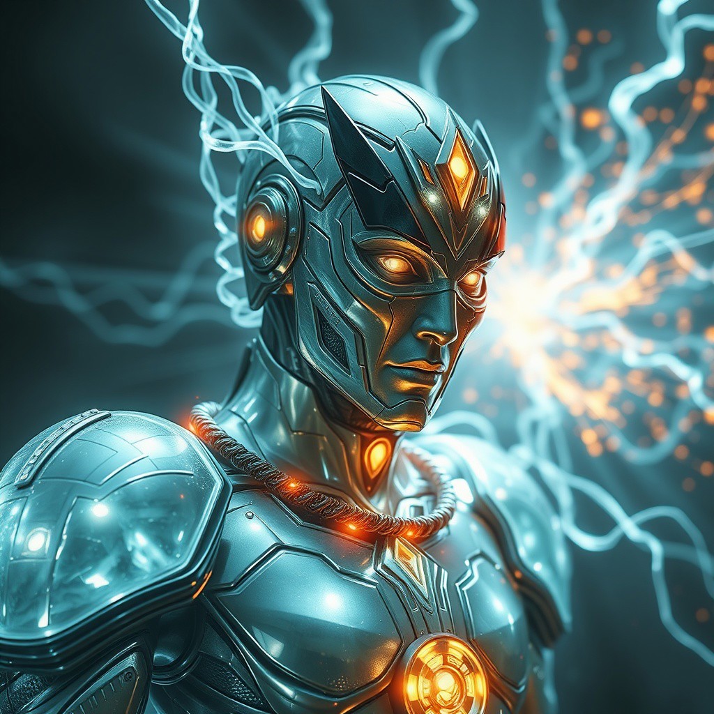 Masterpiece, a thallium/humanoid, 32k, 16k, 8k, cinematic art, realistic art, detail, wearing Mercury like bioluminescence translucent armor, Spirit bomb like energy chromium/radium attack