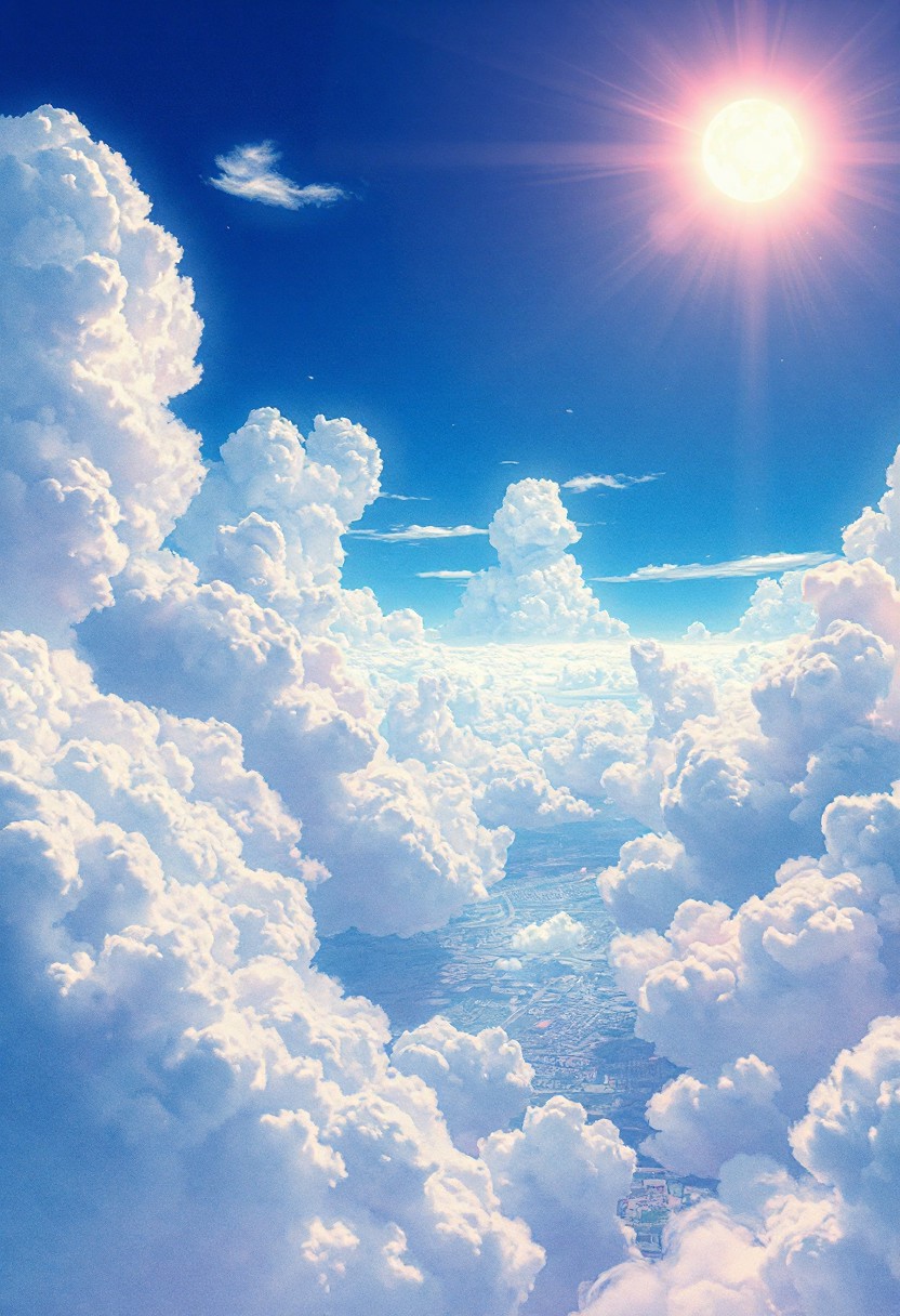 Vast anime-style sky with a massive textured cloud cover stretching across the entire scene, intricate structural cloud formations with detailed bumps and organic folds, scattered open gaps revealing patches of bright blue sky, cinematic view over a peaceful cityscape below, soft sunlight streaming through cloud breaks, pastel color palette (baby blue, soft white, light pink), highly detailed Ghibli-inspired artwork, hyper-realistic watercolor texture, dreamy and emotional atmosphere, 4K ultra-high resolution, sparkling sun in the upper-left corner with glittering rays shimmering through the clouds