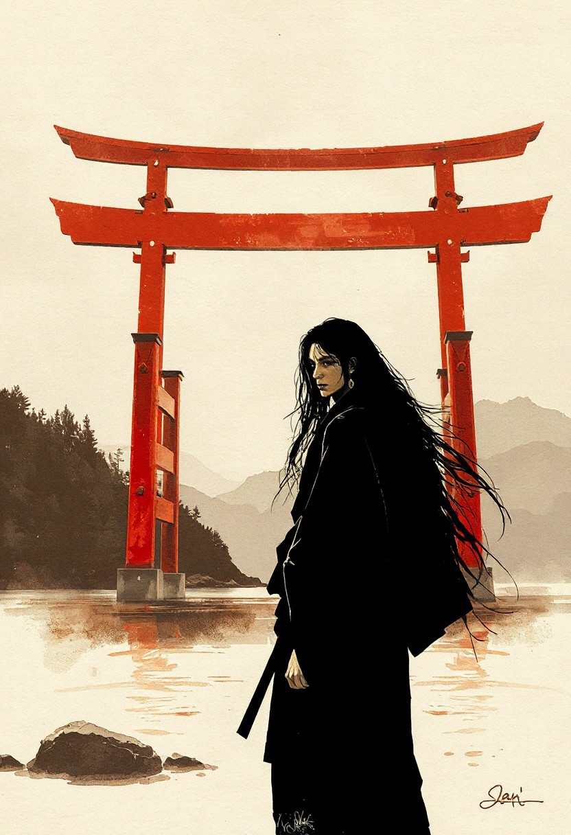 Watercolor Ink Wash, digital image art on rice paper, sepia, henna , Silhouette Art, magnificent, intricate linework with expressive contrasts, soft lighting with dynamic highlights, image of a serene Japanese man with long flowing hair, standing on the shoreline, looking at viewer, with a colossal red torii gate behind her in the Sea of Japan, far from shore, forested coastline, foggy
