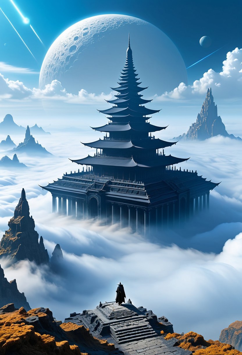 A cloaked traveler walks across an endless sea of clouds, each step glowing faintly — behind him, monumental ruins rise from the mist, their structure part ancient temple, part hovering spacecraft.