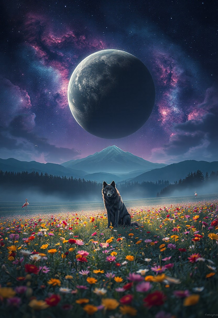 Positive Prompt: masterpiece, best quality, ultra-detailed, cinematic, ethereal atmosphere, fantasy landscape, lone black wolf sitting in a colorful field of wildflowers at night, vibrant but soft flower meadow, vast open landscape, dreamy lighting, soft mist, glowing dark planet in a deep indigo and purple cosmic sky, swirling nebula clouds, stars scattered across the sky, majestic distant mountain, dark pine forest on the horizon, magical and mysterious mood, highly detailed, vibrant yet muted color tones, wide angle view, soft fantasy style, gentle illumination. Negative Prompt: flamingo, bird, daytime, bright sunlight, cartoon, anime style, lowres, bad anatomy, blurry, overexposed, ugly, bad hands, bad paws, poor composition, extra limbs, low quality, grainy, saturated colors, text, watermark