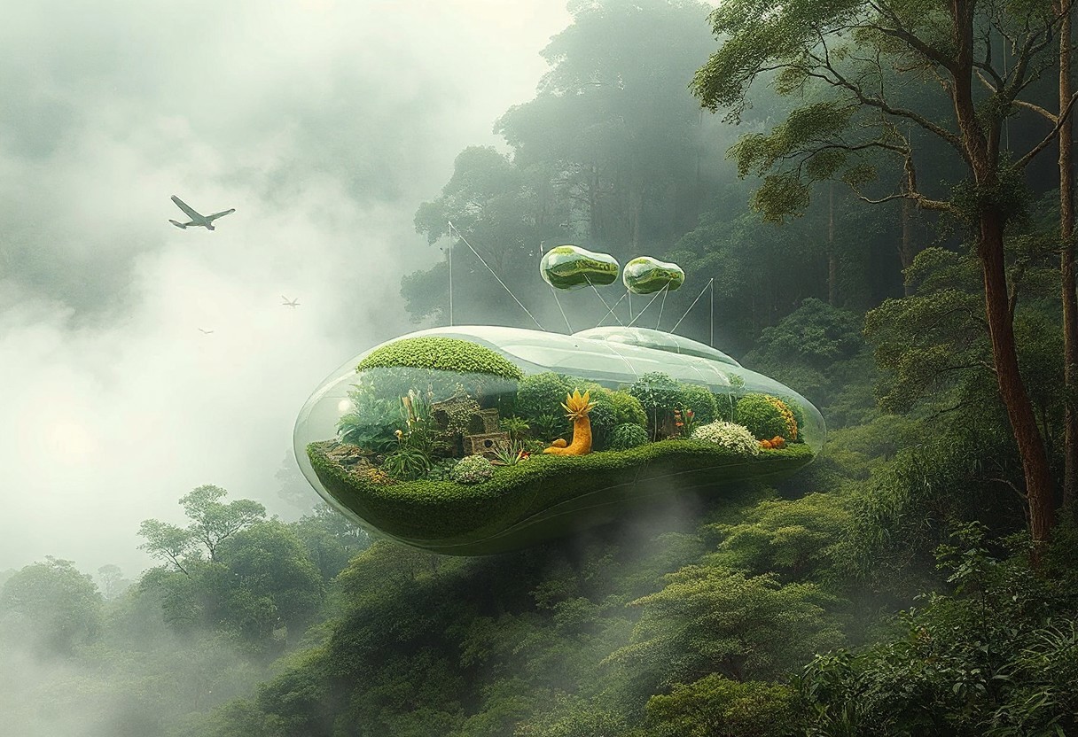 In a speculative drawing collage style, a biotech simbiogenetics bank micro ecotone is depicted as a sleek, fractal-like structure embedded within a lush, humid fog-filled environment. The compact symbiotic design, grounded in amphibious principles, features inflatable deployable structures that disperse seeds, vegetation buds, nutrients, and pollinators through various methods including ballistic, wind, and water. This intricate system is seamlessly integrated with atmospheric rivers, connecting the Amazonia Forest to the Chingaza Paramo, showcasing the interconnectedness of regional ecosystems in a highly detailed, wide background.