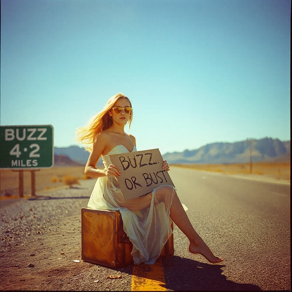 <lora:retrofilm_V02:1> analog film photo ,faded film, desaturated, 35mm photo, Hasselblad 501 camera, grainy, vignette, vintage color film, Lomography, stained, highly detailed, film border, thin photo border, vintage photograph, 1960s vintage photo, (masterpiece, best quality, ultra photorealistic, 8K, cinematic lighting, shallow depth of field), bokeh, A young woman on lone desert road stretching through Death Valley. she is is sitting on an old vintage suitcase on the side of the road holding a cardboard sign with writing that says “BUZZ OR BUST”:0.8, Golden hour, sunset, rim lighting, light rays, light particles, large road sign with white lettering on green background says “BUZZ 42 MILES”:1.9, thin white summer dress:0.7, see through dress, gently blowing in the soft breeze. Her long blonde hair moves naturally with the wind, catching the warm sunlight, (realistic skin:1.3), yellow lens sunglasses:0.5, large full round breasts, no bra, wide hips, long toned legs, She wears a short flowing summer dress, high leg slits,
