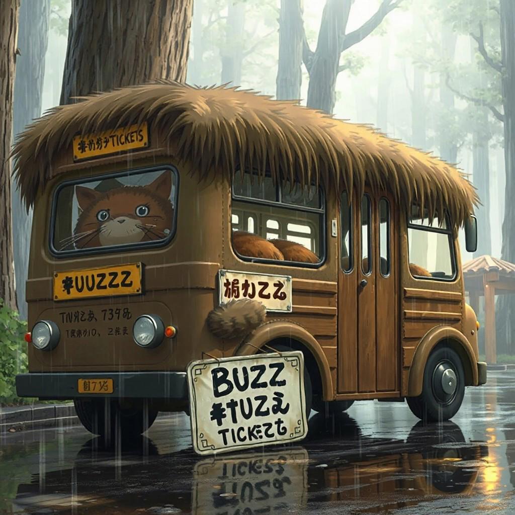 The catbus from the anime "tonari no totoro", with a sign on the side of the hairy catbus reading "Buzz Tickets". Miaysaki anime style. miyazaki anime style background in a wood. rainy day.