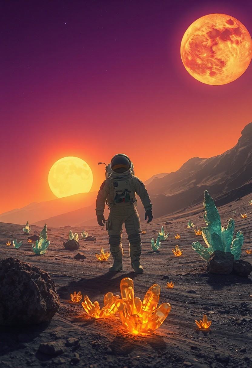 A lone astronaut exploring the surface of a distant alien planet, strange glowing plants and crystalline structures scattered around, two suns setting on the horizon, vibrant purple and orange sky, sci-fi concept art, highly detailed spacesuit, realistic lighting, inspired by Interstellar