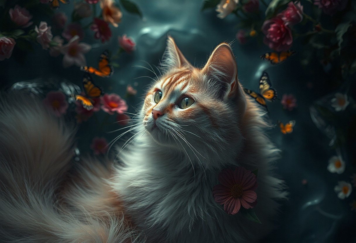 masterpiece, best quality, amazing quality, very aesthetic, absurdres, highres, newest, HDR, 8K, high detail, smooth shading, glossy surfaces, subtle, high contrast, dak depth, cat, sacred, mysterious, dreamlike, fantastic, moonlight, Grimoire, flowers, colorful flowers and colorful butterflies, flower effects, diagonal angle, from above, dutch angle, beautiful atmosphere, muted colors, cinematic composition, natural lighting, water color,