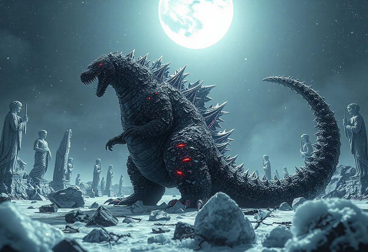 Create a highly detailed, 4K illustration of a Medusa Worm-inspired Godzilla, standing in a winter landscape with glittering ice and black slime, chemrail, and thin spikes. The model should embody greed and have a long, plump form, with several broken statues surrounding it. Use a monochrome 3D model for the main figure, with a pop of color in the eyes, clothes, and chemrail. Incorporate vivid emotions, sharp lines, and harmonious colors to bring the scene to life. Use Octane Render, Unreal Engine 5, and a dynamic action pose to enhance the visual appeal, and draw inspiration from artists such as Alphonse Mucha, Artgerm, Greg Rutkowski, and WLOP. Ensure the final piece features a powerful message, stunning colors, and captivating lighting to make it trending on ArtStation and CGSociety.scopophobia