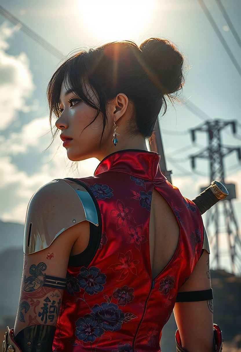 armor reflects fractured sunlight like liquid steel. The backdrop is impossibly alive — sky and machine bleed into each other. Her crimson cheongsam hugs her synthetic frame, patterned in royal blue chrysanthemums, which shimmer subtly with each shift of light. The sleeveless cut reveals full cyborg arms: one sleek and polished, the other layered with tattoo-like circuit glyphs glowing faintly. On her back, a katana with blackened edge and etched runes rises like a totem, locked into a reinforced spine port. Thin fiber wires lead from her shoulder to a distant power pole, barely visible above. Her glowing earrings sway faintly in a wind you can’t feel, casting tiny flares of red across her collarbone. Lighting: Dramatic vertical sunlight with iridescent color bounces from the sky, highlighting chromatic steel and cheekbones. Environment: Heaven-machine hybrid vista, a dreamlike atmosphere fused with electric cables overhead, power boxes quietly humming. Mood: Stilled voltage, a goddess of the artificial heavens resting before ignition. <lora:MoriiMee_Gothic_Niji_Style_FLUX:0.3500000000000001> <lora:AsirAsianPhotographyflux:0.7000000000000002>