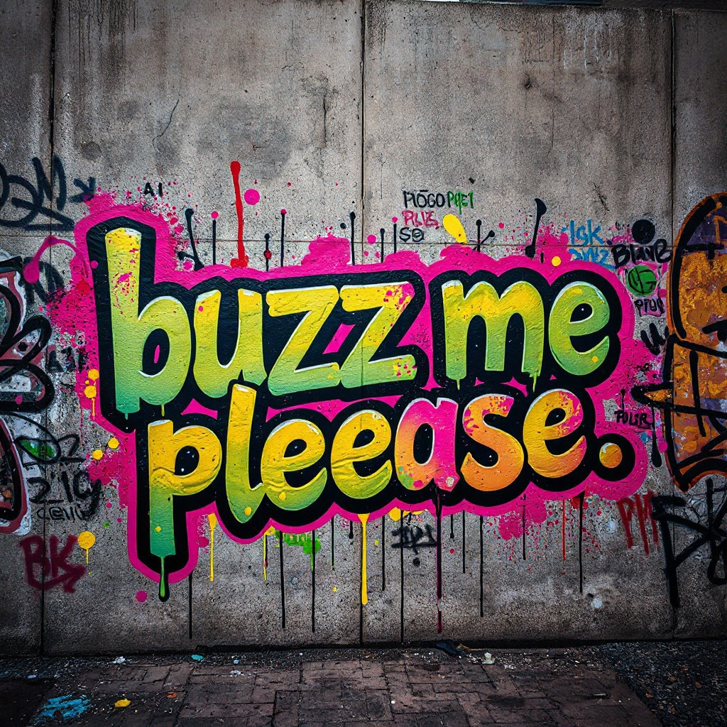 "A vibrant and colorful graffiti wall in an urban setting, featuring bold and stylized text that reads 'buzz me please', spray-painted with dynamic drips and splatters, surrounded by intricate graffiti art, tags, and abstract designs, realistic texture of concrete wall, vibrant neon colors, high contrast, urban atmosphere, gritty yet artistic, photorealistic details, 8K resolution, cinematic lighting, capturing the essence of street art culture, raw and edgy vibe, perfect composition, ultra-detailed, ultra-sharp focus, stunning visual impact."