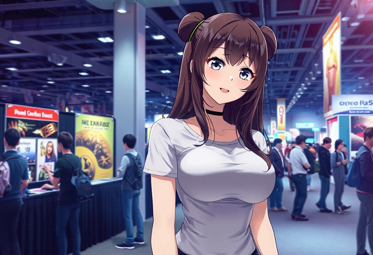 An anime picture of a beautiful woman standing at the convention. She is wearing a tight T-shirt. She has large breasts and large ass <lora:hourglassv32_FLUX:1>