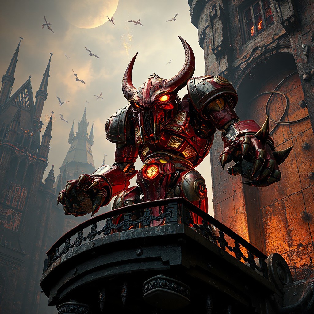 "Ultra-detailed 3D render of a Steel Ogre Grotto, a towering crimson-red mechanoid with gold filigree armor plating, featuring an oversized hammerhead skull glowing with molten circuitry and a compact, heavily-jointed body. Standing in a defensive stance atop a crumbling balcony of the Phantom Fortress Enterblathnir, its piston-driven fists crackle with energy. The fortress looms with gothic spires, floating debris, and holographic siege maps projected across corroded iron walls. Dramatic low-angle shot with Unreal Engine 5 realism, Octane Render textures, and Raphael-style chiaroscuro lighting. Metallic surfaces reflect ember-like sparks, while splash ink weathering effects blend with dieselpunk rivet detailing. 8K resolution, ArtStation-trending composition, golden ratio framing, dominated by vermillion and burnished gold with chromatic aberration flares."