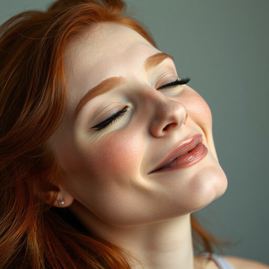 Beautiful redheaded woman with nostrils wide, face flushed, mouth slightly open, head tilted back a bit, eyes half closed, pleased, aroused, head shot