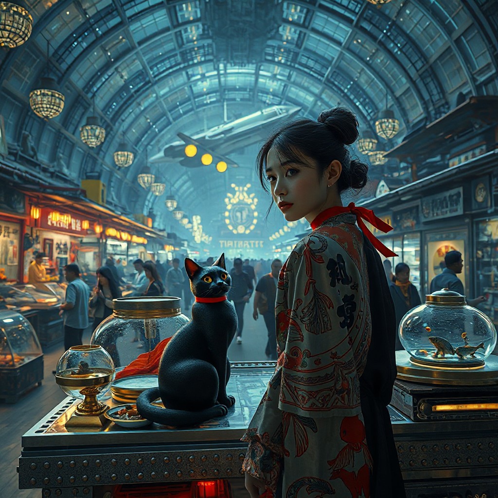 Setting is a futuristic shopping market at night in a huge under water domed building with fish and huge sea creatures visible through the transparent dome, the market is comprised of street vendors selling robot parts, food, weapons, and robots. (((((CLASSICALLY STYLIZED LIGHTING AND ARCHITECTURE FROM CHINA INDIA JAPAN FRANCE EGYPT ROME AND GREECE))))), A gold fish bowl is on the table with a cat-fish) People wearing futuristic cyberpunk clothing are walking through the street market shopping and eating, A sleek black cat with red collar sits on a cluttered metal riveted desk with transparent top and micro-LED lighted computer components visible inside, On the desk is an ebony and gold maneki neko statue and futuristic art deco lighting, (((a beautiful woman, 24 years old, is standing in the foreground FACING THE VIEWER, she has an expression of interested curiosity)))))), the sleek black cat with red collar is sitting on the desk and watching the people walking by in the busy street market, the woman is dressed in futuristic cyberpunk ECLECTIC style yukata with a low neck line alluring aesthetic. An enormous art deco inspired starship with futuristic lighting and an enormous space station are visible in the background among the stars, The woman's hair is elegantly tied up with a ribbon. Artistic cyberpunk, dynamic perspective, (((overall architectural aesthetic is Art Deco Cyberpunk))). Epic image that elicits a feeling of wonder and awe,