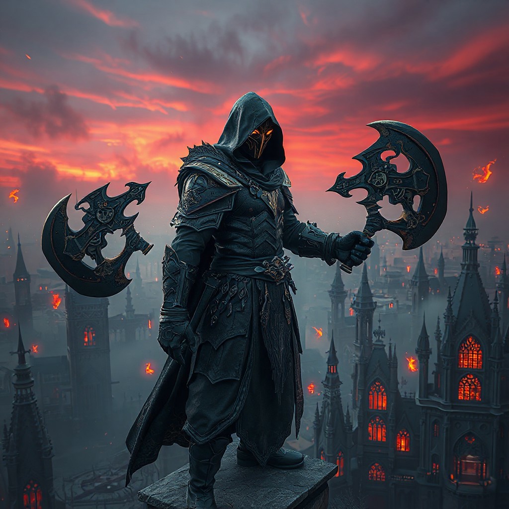"A cinematic portrait of Black Luster Soldier - Sacred Soldier: armored warrior in a matte-black hooded cloak, ornate mask with gold filigree and glowing runes, wielding twin obsidian battle-axes. Standing in a dynamic pose atop Artmegia the Academy City of Divine Arts—a sprawling gothic metropolis with crimson-lit spires, floating magical tomes, and shattered stained-glass windows. Hyper-detailed textures: cracked armor plates, smoldering axe blades, and ethereal cloak fabric. Stylized with Dark Souls grandeur and Final Fantasy flair. Rendered in Unreal Engine 5 realism, Octane Render gloss, and Dutch angle composition. Color palette: blood-red skies, ash-gray architecture, and golden magical accents. Background features swirling energy storms and faint glowing sigils. Trending on ArtStation, 8K HDR, golden ratio framing. Tags: dark fantasy warrior, menacing aura, hyperrealistic armor, volumetric fog, cinematic depth-of-field."