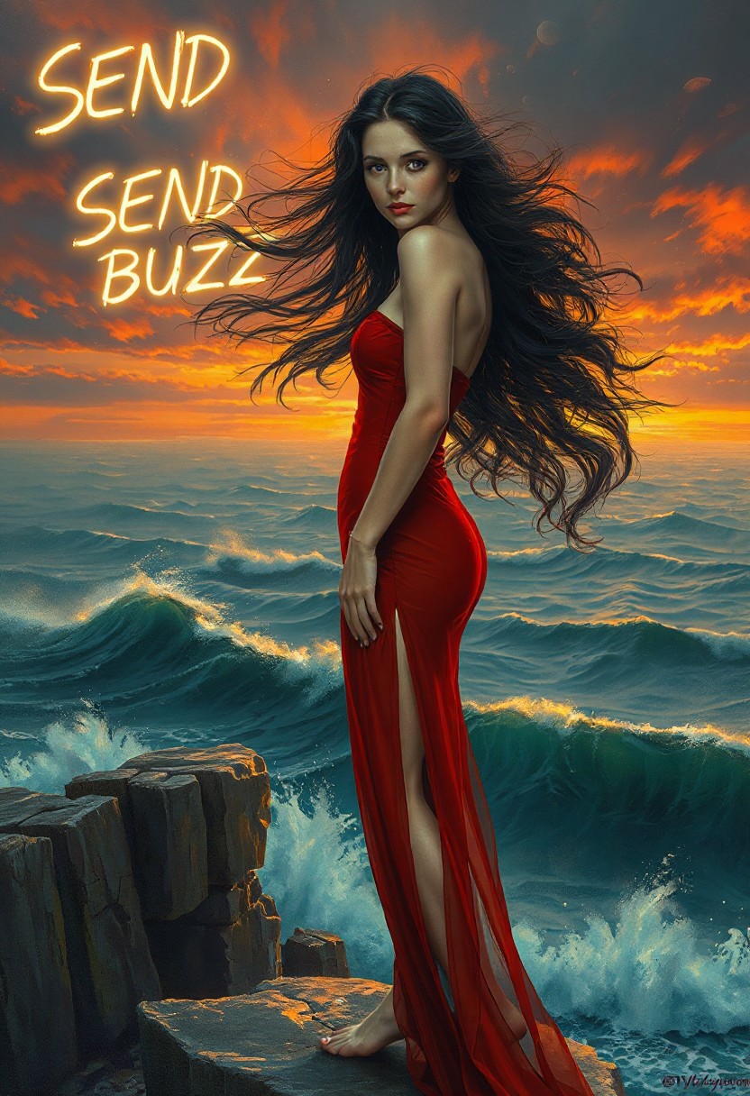 score_9, score_8_up, score_7_up, detailed masterpiece, (maxfield Parish style painting:0.9), 1woman, (((pale white skin:1.5))), 25 years old, tall slender redheaded, long wavy black hair being blown in the stormy wind, medium full round breasts, no bra, wide hips, long toned legs, slender waist, woman standing on a large cliff overlooking the ocean ocean, stone cliffs overlooking the stormy ocean, sunset, stormy sky’s, large windblown waves:0.8, colorful sunset sky, light rays, light particles, magical glowing writing in sky says “SEND BUZZ”, looking at viewer, perfect pale white skin, cute face, Scandinavian features, big blue doe eyes, full pouty lips, swarthy, sultry, detailed black windblown hair, long flowing sheer red dress blowing in the wind, high leg slits, thighs, standing, dreamy light, perfect skin, dramatic lighting, front view, dreamy blurred colorful background,