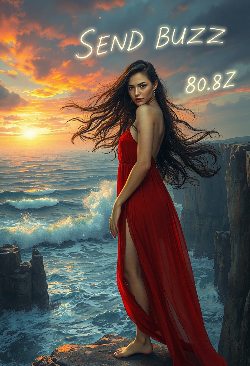 score_9, score_8_up, score_7_up, detailed masterpiece, (maxfield Parish style painting:0.9), 1woman, (((pale white skin:1.5))), 25 years old, tall slender redheaded, long wavy black hair being blown in the stormy wind, medium full round breasts, no bra, wide hips, long toned legs, slender waist, woman standing on a large cliff overlooking the ocean ocean, stone cliffs overlooking the stormy ocean, sunset, stormy sky’s, large windblown waves:0.8, colorful sunset sky, light rays, light particles, magical glowing writing in sky says “SEND BUZZ”, looking at viewer, perfect pale white skin, cute face, Scandinavian features, big blue doe eyes, full pouty lips, swarthy, sultry, detailed black windblown hair, long flowing sheer red dress blowing in the wind, high leg slits, thighs, standing, dreamy light, perfect skin, dramatic lighting, front view, dreamy blurred colorful background,