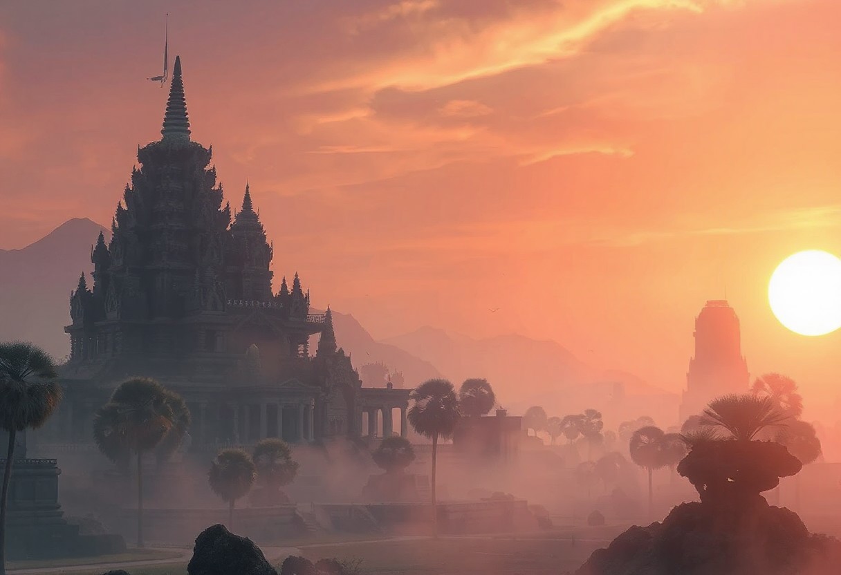 dawn of a new world, ancient cambodian temple in the mist of a futuristic alien landscape.