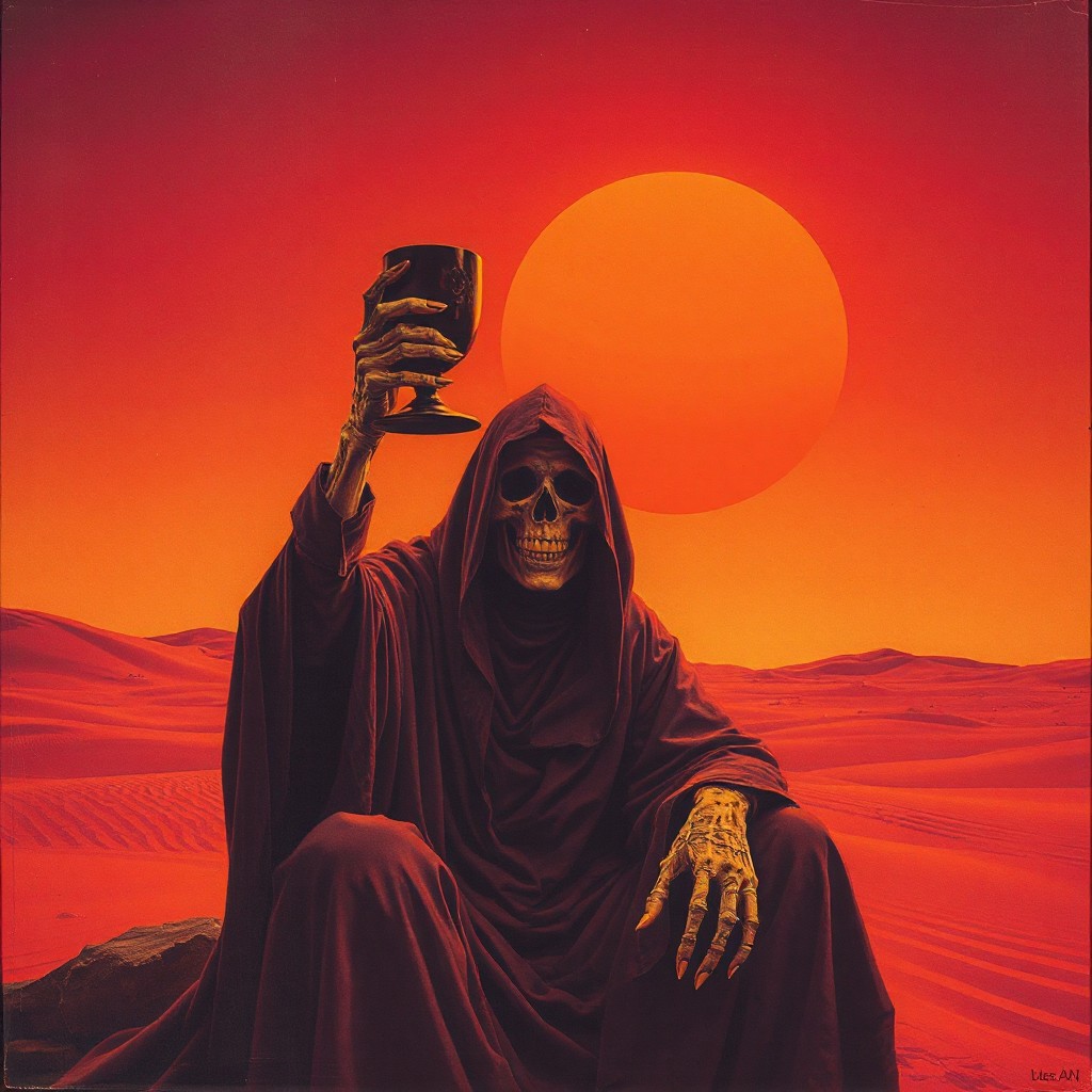 Dark art of an cloaked ominous monk from the 70s-style pulp paintings, seated in a psychedelic desert, lifts a blood-dripping goblet toward a blood-red sun with his bony fingers. The sky ripples like heatwaves. The monks grinning skeletal face is barely visible. Duotone: Burnt orange and deep plum. Mood: Occult ritual meets 80's crinkled poster art style. Grim reaper, doom metal-style, gritty, desert ritual, tales from the crypt
